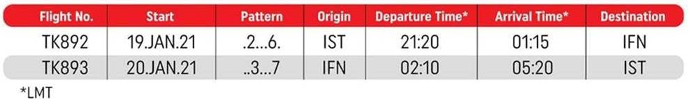 احتراما به استحضار میرساند که پروازهای استانبول-اصفهان-استانبول هواپیمایی ترکیش از تاریخ 19 ژانویه 2021 با فرکانس 2 پرواز در هفته شروع خواهد شد. برنامه پروازی طبق جدول ذیل میباشد.