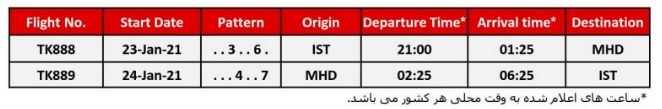 مفتخریم برقراری مجدد پروازهای شرکت هواپیمایی ترکیش در مسیر استانبول مشهد، مشهد-استانبول از تاریخ 23 ژانویه را با فرکانس 2 پرواز در هفته را به استحضار برسانیم. برنامه پروازی مطابق جدول ذیل میباشد و در صورت ایتجاد هر گونه تغییر، اطلاعات متعاقبا به حضور اعلام میگردد.